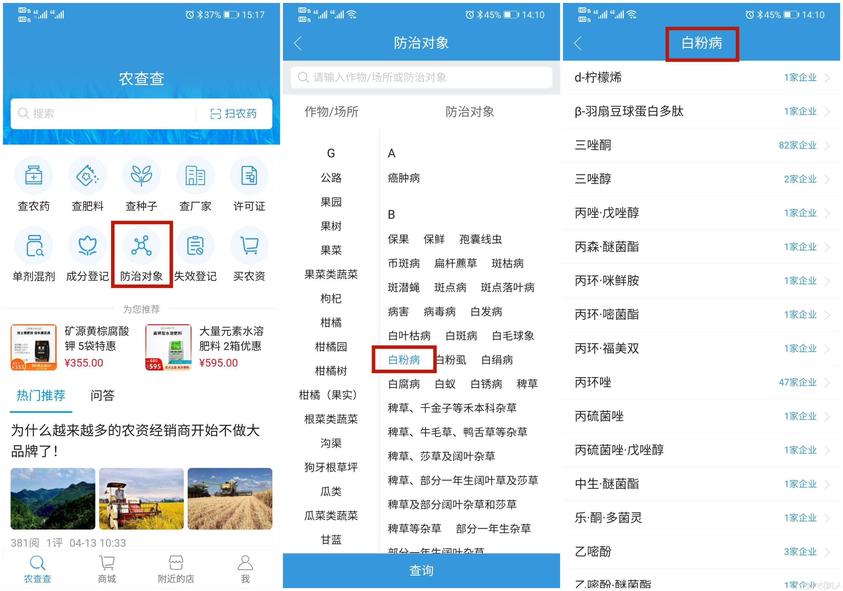 点击首页“防治对象”,在右侧列表中选择“白粉病”,点击查询即可出现白粉病的所有防治药剂及生产厂家。