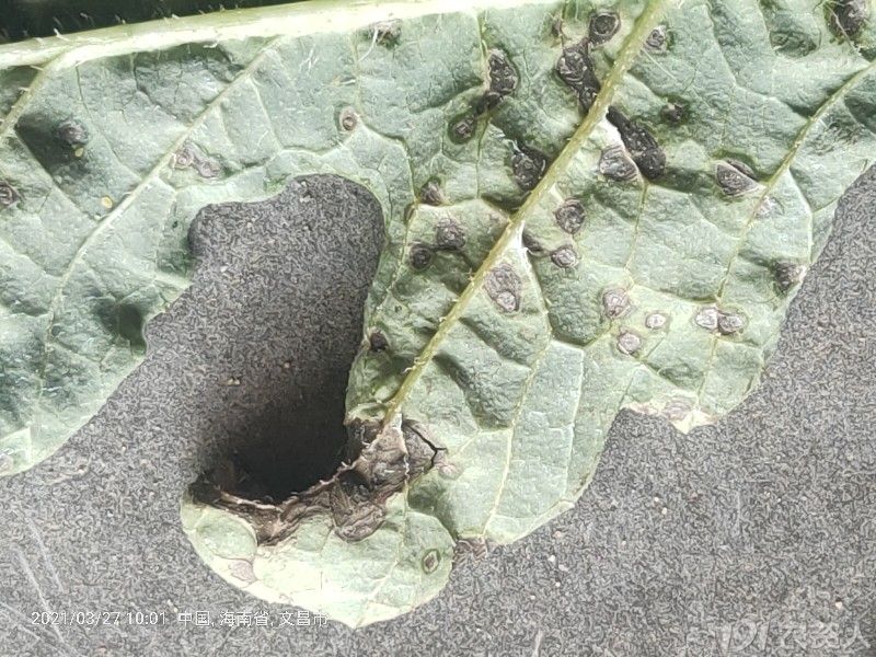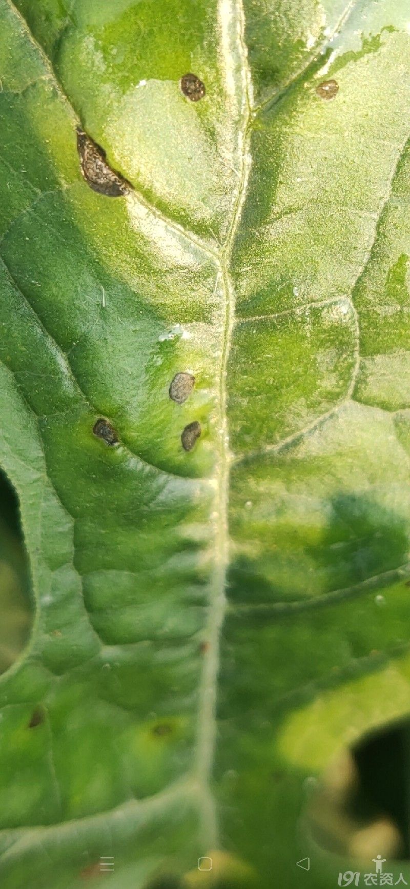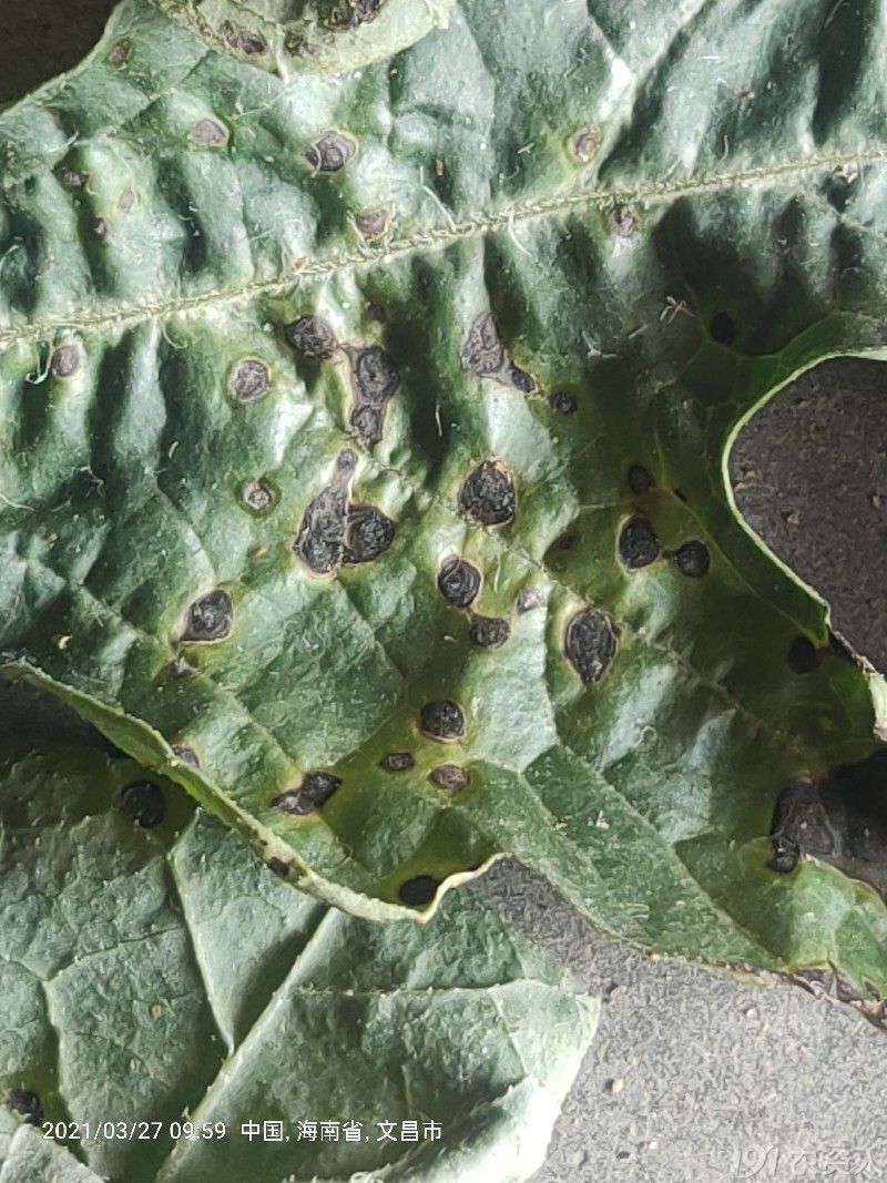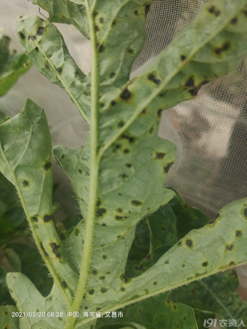 答:这个是西瓜上面的炭疽病也有细菌性叶斑病,如果你要快速治疗的话,可以使用45%的咪鲜胺,1500倍进行喷雾。