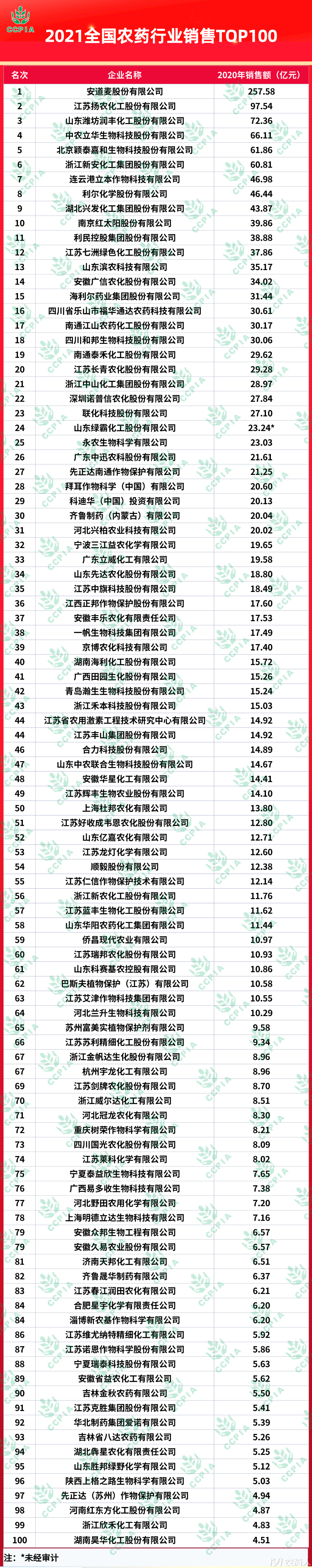 2020年,新冠疫情爆发,得益于国家相关政策的支持以及全行业的共同努力,疫情期间农药生产有序进行,产量稳增,全行业主要经济指标依然保持增长。从榜单看,全国Top100农药企业销售额多数呈现增长态势。