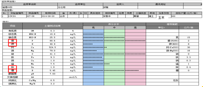 这个结果能测出土壤里面的有机质、铵态氮、硝态氮、磷、钾、钙、镁、硫、铁、铜、锰、砷、硼、酸碱度、交换性酸、钙镁比、镁钾比的含量,能对大家的土地进行一个诊断,知道大家的土壤里面缺什么。