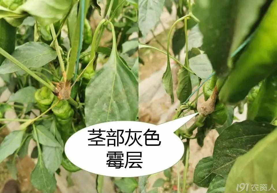 2.茎部一般在分叉处或果柄处发病,病部出现浅褐色,表面有大量灰色霉层;