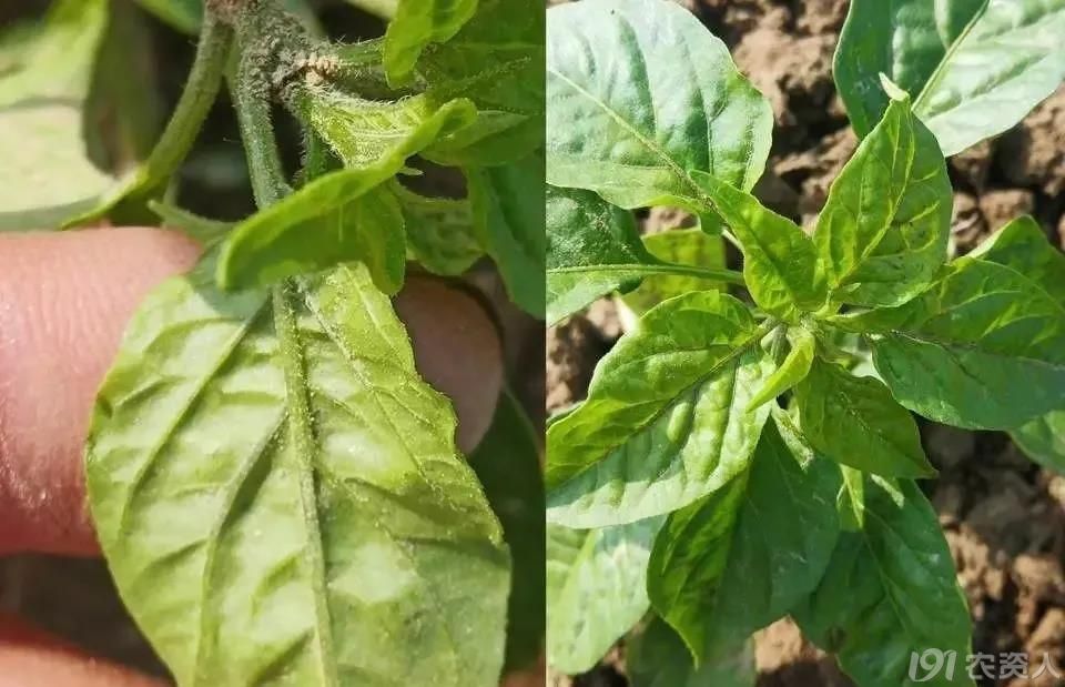 3.畸形,叶脉褪绿出现黄绿相间的症状,叶片增厚,边缘上卷,茎节间缩短;