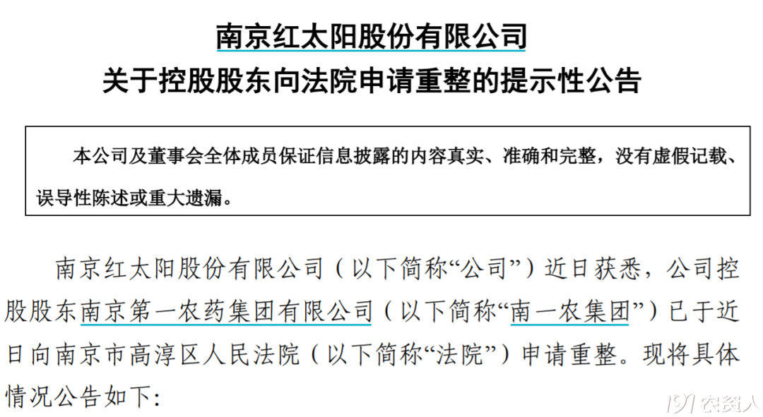 6月1日晚间,ST红太阳公布,公司近日获悉,公司控股股东南京第一农药集团有限公司(“南一农集团”)已于近日向南京市高淳区人民法院(“法院”)申请重整。