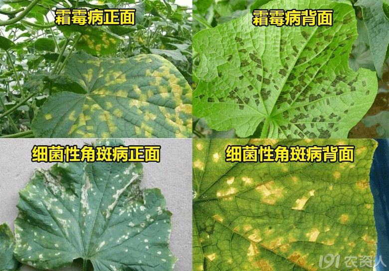 霜霉病斑黄褐色,角斑病斑灰白浅。