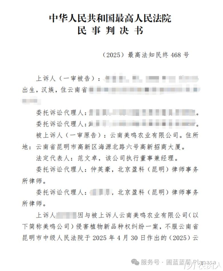 2025年11月,最高人民法院就云南美鸣农业有限公司(Planasa中国)诉赵某某侵害“普拉布鲁1542”植物新品种权纠纷案作出(2025)最高法知民终468号终审判决,驳回上诉,维持原判。此案成为中国首例获最高法院终审判决的蓝莓新品种权案件,具有重要的司法里程碑意义。