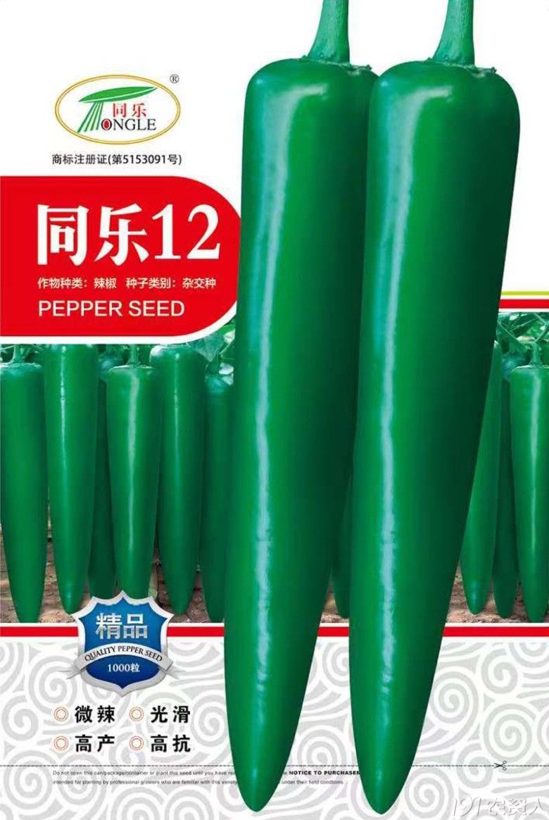 同乐12属中早熟,羊角型,青果深绿色尖椒,果长26cm左右,果粗3.5cm左右,单果重80-100g,辣味中等,果面光滑且光亮,肉厚,耐贮运。突出特点是该品种具有果型大,果个长,产量高的优势,在市场上易销售,抗病性强,耐热耐湿,采收期长。在肥水充足管理得当条件下,亩产可以达到5000kg以上,是目前青皮尖椒种植基地的首选品种。