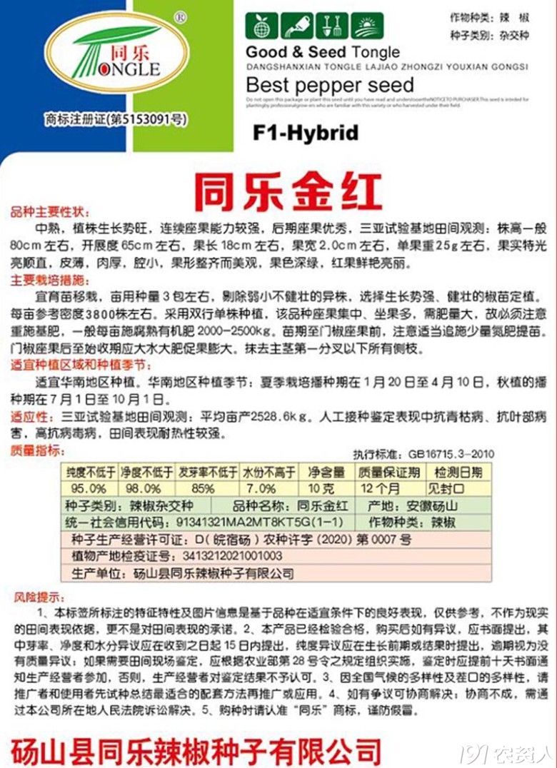 同乐金红,中熟,植株生长势旺,连续座果能力强,后期座果优秀,果长18cm左右,果宽2.0cm左右,单果重25克左右。果实光亮顺直,皮薄,肉厚,果型整齐而美观,嫩果深绿,红果鲜艳亮丽。是鲜椒走市场,腌渍、制辣椒酱较理想产品。一般亩产3000公斤左右。百度“同乐金红”了解该品种更多信息。