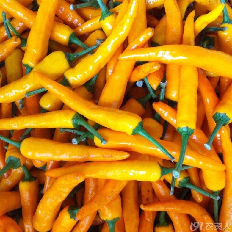 艳黄朝天椒是杂交一代单生朝天椒品种,中熟、高辣、嫩果绿色,熟果橘黄色,老熟转黄色,光亮艳丽,椒条顺直,光滑无皱,口感香辣,果腔充实较硬,耐储耐运。果长8厘米左右,果粗0.8厘米左右,植株长势强健,耐热耐湿,高抗病毒病、炭疽病、疫病,是目前高端市场的俏销品种,适合豫、鲁、苏、皖、晋、云、贵、川、陕、甘、宁等适宜种朝天椒的地区种植。百度“艳黄朝天椒”了解该品种更多信息。
