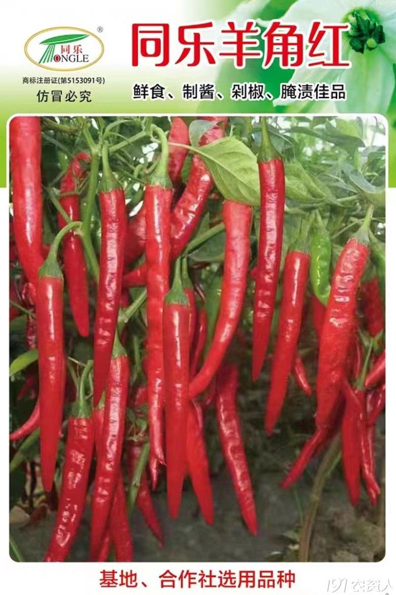 同乐羊角红是在鸡泽羊角椒品种资源基础上,经提纯复壮选育改良而成。中熟、皮薄、肉厚、色鲜、香辣。果长20cm左右,果径2.0cm左右,单果重25g左右,形似羊角。一般亩产5000斤左右,高产田可达6000斤以上。口感好,可青食、红食、鲜食及制酱、剁椒、腌渍、干制加工。百度“同乐羊角红”可了解该品种更多信息。