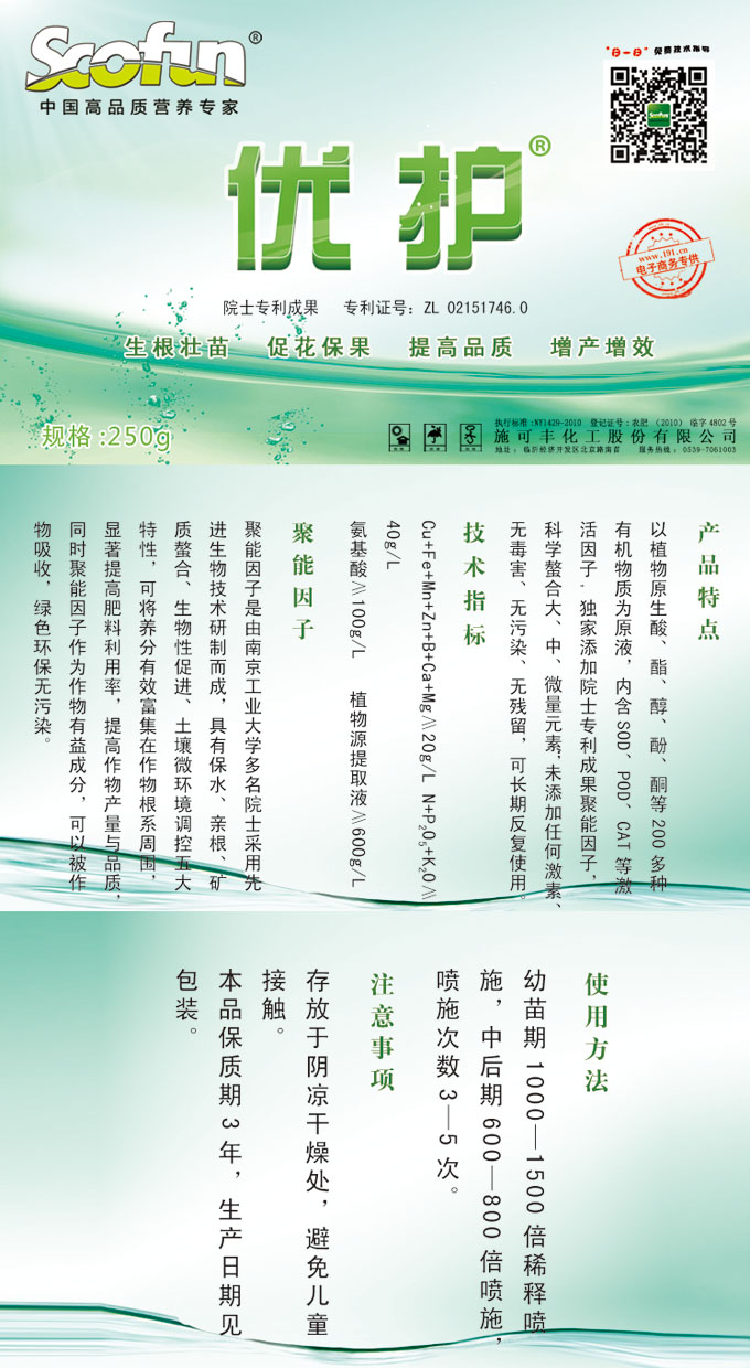 优护-营养超级动力专家。N+P2O5+K2O≥40g/L,氨基酸≥100g/L,Cu+Fe+Mn+Zn+B≥20g/L,植物原提取液≥600g/L