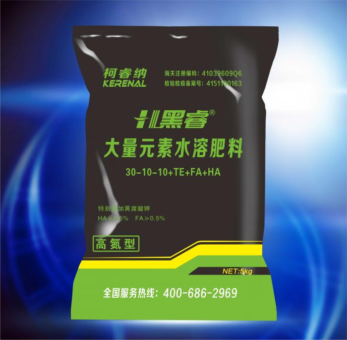 黑睿高氮型大量元素水溶肥采用国际先进技术,富含作物生长所需的氮磷钾大量元素,并添加了生物活性肽、多分子土壤转化酶和螯合态中微量元素,特别添加黄腐酸钾、矿源腐植酸等优质养分,营养全面,配伍合理。本品添加的黄腐酸钾富含羟基、羧基、酚基等多种官能团,显著提高作物对氮磷钾等多种元素的吸收利用,小分子黄腐酸促使根系生长,促使细胞分裂,活化土壤中可利用的养分粒子,改良土壤结构。本品能够快速补充氮元素, 缓苗快,促进枝条健壮,发芽饱满,叶片浓绿,加快新叶和枝梢抽生,促进作物营养生长。缓解生理性花叶、黄叶、卷叶、缩叶等生理性缺素症状。