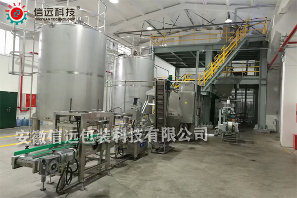 陕西宝鸡液体水溶肥生产设备 189-5512-2736(微信同号)规定功能、流程、配置 (一)加热反应釜 (304不锈钢) a、 整机材质为工业级304不锈钢制作,三层搅拌带保温,内4mm夹套3mm包皮2mmb、 容积:≥2000L具有两个观察视孔,一个直径450mm的投料人孔c、 电机功率:4kw/台;加热功率:54kw/台d、 搅拌形式:框式e、 具有液位可视装置,采用高低料物位计,可实时监测桶内液位变化。f、整机外表面抛光处理美观、易清洗。(三)双联过滤器(304不锈钢) 进行粗细两道过滤,不锈钢过滤网规格为80目;密封垫为食品级耐温耐油硅橡胶。(四)离心泵(304不锈钢) 全不锈钢结构设计复合食品卫生要求。可与计量高位搅拌缸料位感应开关联动实现自动控制泵送工作启停,无需人工干预。该机适用于各类流体的自动泵送。耐高温、对泵送物料无破损、运行平稳、无噪音;便于维护 (五)中间储料罐(304不锈钢)1、整机材质为工业级304不锈钢制作,厚度内3.00mm,外2mm。2、容积:≥2000L,上盖为平开口。3、电机功率:3kw。4、搅拌形式:框式5、具有液位可视装置,采用高低料物位计,可实时监测桶内液位变化。6、 整机外表面抛光处理美观、易清洗。(六)双头称重式灌装机1、称重式自动灌装机,由直线排列的秤台(带辊道),链条推杆进出瓶机构,快、慢速灌装(带气缸下潜)机构,进料过渡料箱,称重控制仪表及可编程控制单元组成。该液体灌装秤可以满足多种液体自动灌装的需要,可满足无泡沫、有泡沫液体的灌装。2、设备特点:2.1、采用加拿大杰曼称重传感器和专业控制仪表,确保了灌装计量的高精度。称重传感器上采用独特的滚珠走瓶方式,保证灌装完毕后走平稳出瓶。2.2、采用快、慢速灌装阀,在保证计量精度的同时不影响整体灌装的速度。配备电机驱动灌装头下潜机构,平稳下潜,采用液面上或液面下灌装。2.3、灌装头加可转动接液杯,灌装完成后接液杯将灌装头上残留的物料收集住,防止物料滴漏污染瓶口。2.4、称重控制仪表具有标准RS -485接口,系统采用数字控制,调整及设定均在触摸屏中实现。可设定毛重或净重方式灌装,实际灌装量即时在触摸屏中显示,方便直观。2.5、空桶检测,无桶不灌装;防桶设计。2.6、独立电气箱密封设计,布局合理,方便检修,主要部件(PLC可编程控制器、人机界面、变频器、开关电源等)均选用法国施耐德国际著名进口品牌元件,确保了设备的稳定运行。(七)自动压盖机 自动塑料桶滚压压盖机主要用于开口桶、涂料桶、润滑油桶、包装桶、油漆桶、手提桶(方便桶)系列的标准桶封盖的必备专用工具。广泛用于制桶、制罐、润滑油、涂料、化工、石油、粮油、等液体包装行业的必备用品。压盖机是专门为国际通用的标准桶封盖而设计的。它的结构合理、制作精确、外形美观、操作方便。用户开始使用时,只要调整好主轴上的螺母位置后便能正常使用。辊道自动输送及自动光电感应。主要零件采用钢材做成,具有坚固耐用、磨损小、机械强度高、不易折断、封盖严密等优点。压盖方式:两次压盖(先压一半、再压一半)。控制方式:电子—气动控制输送方式:辊道自动输送主要技术参数1.灌装范围:5-30L ;2.计量精度:±0.2%(注:灌装精度取决于物料的粘度以及物料供给的连续性和稳定性);3.灌装速度:≥4桶/分钟(10L) (八)、链板式输送机1)输送设备与灌装生产线效率配套,速度可调。 2)输送机长3000mm,宽300mm,高度850mm±50mm3)材质为304不锈钢。(九)、不锈钢管阀件含50mm不锈钢管道及手动和自动球阀、排污口。(十)、电气控制系统含有反应釜、中间储罐、转子泵、灌装机、压盖机、及链板输送机的电源接口,储罐、泵及灌装输送线的自动化控制,储罐及灌装机缓冲罐料位控制系统等;电控箱材质为304不锈钢。