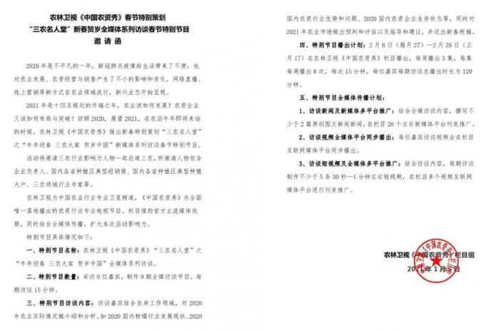 活动将邀请三农行业影响力人物一起论道三农,所邀请人物包含农资企业负责人、国内各省种植区典型经销商、国内各省种植区典型种植大户、三农领域行业专家等。访谈嘉宾结合自身工作领域,专业剖析2020年农业实际情况。如2020国内柑橘行业发展现状、2020国内农资行业优势和问题、2020国内农资企业生存状态等,同时对2021年农业市场做出预判和评估以及指导和建议,并送上新春祝福。不管您是电视迷,是新闻阅读爱好者还是短视频平台重度用户,都可以以自己最喜爱的方式收看《三农名人堂》之“牛年迎春 三农大家 贺岁中国”全媒体系列访谈春节特别节目,了解自己最感兴趣的农业领域新话题。
