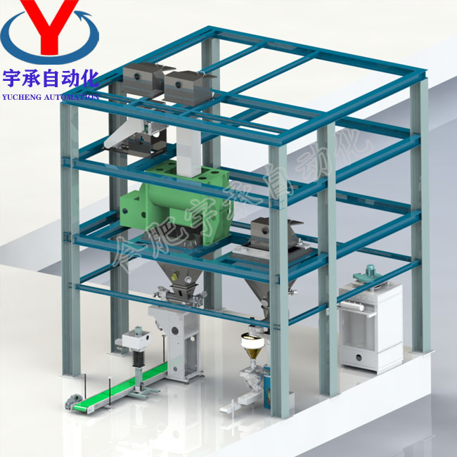 将混合好的物料卸入1.2m3过仓内。包装机储料仓包括:料仓体、料仓上盖、壁强制下料装置。