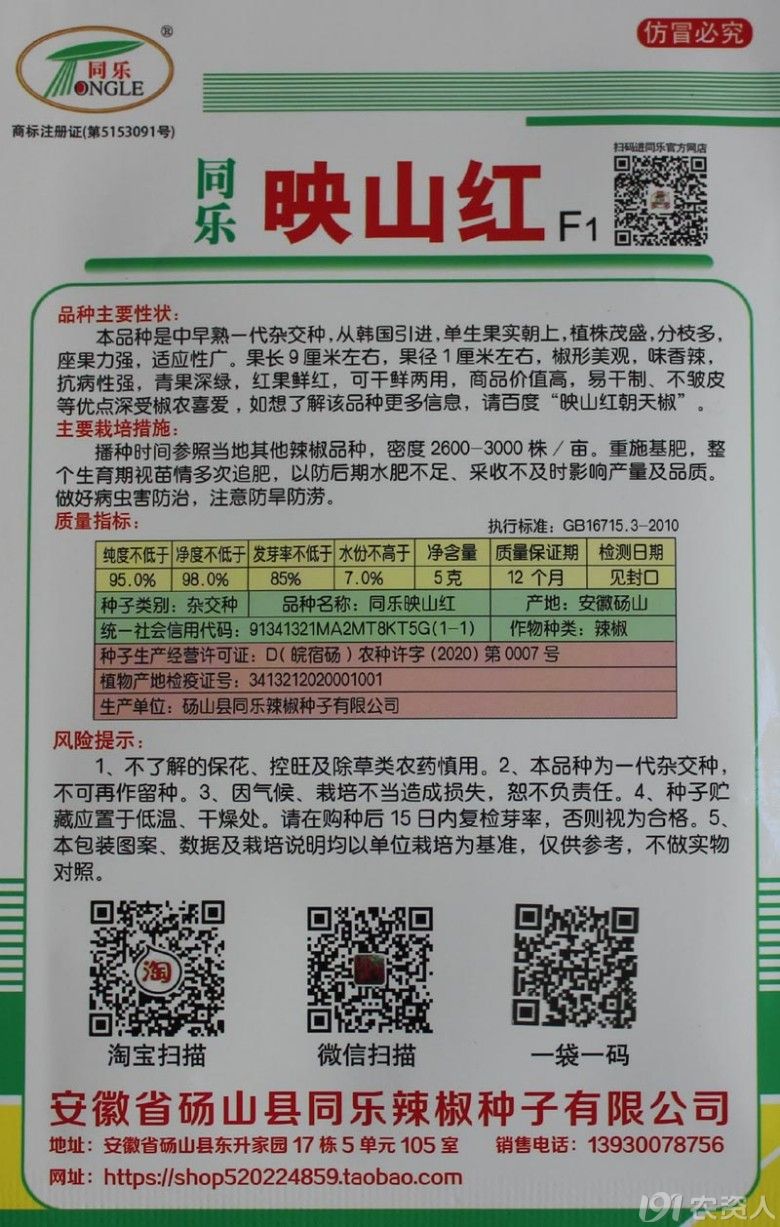 特别提醒:现已发现在四川、重庆等多地有不发分子冒充我公司映山红朝天椒种子出售,请购买者看清包袋正面竖排两行红字“高产抗病果实大,干鲜两用卖相好”,凡没有这两行红字的,请谨慎购买,以免买到假种子。购买前可百度“映山红朝天椒”了解详情。