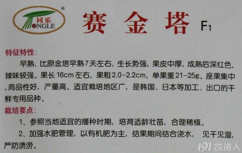 赛金塔辣椒属早熟品种,比原金塔辣椒早熟7天左右,生长势强,果皮中厚,成熟后深红色,辣味较强。果长16厘米左右,果粗2厘米左右,单果重22克左右。座果集中,商品性好,产量高。是制作辣椒干、鲜椒速冻出口及加工辣椒酱的干鲜两用优良品种。百度“赛金塔”了解该品种更多特性。