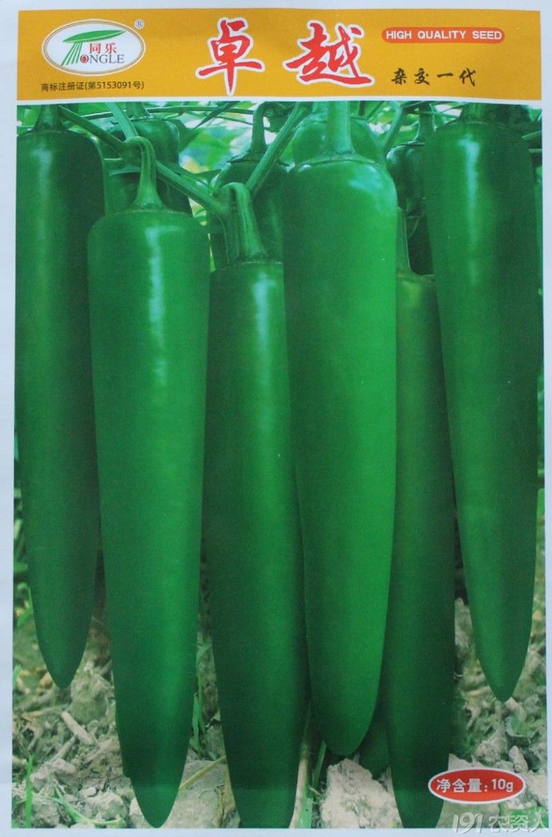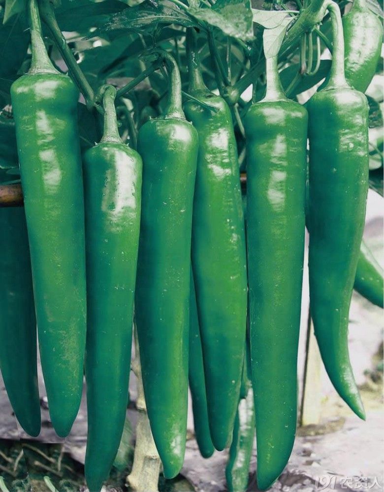 卓越绿皮尖椒,中熟杂交品种,抗病性强、耐热耐湿、挂果期长,产量高。果色深绿,光滑无皱,果长23厘米,果径3厘米,单果重50克左右。肉厚匀称、硬度高、耐贮运、产量高。百度“卓越绿皮尖椒”了解该品种更多特性。
