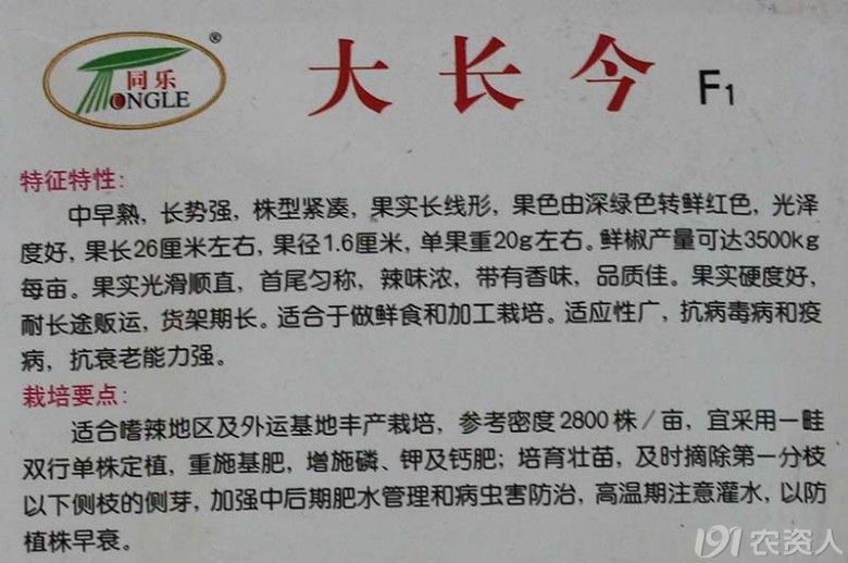 大长今线椒中早熟,长势强,株型紧凑,抗病性强,果实长线形,果色浅绿,光泽度好,果长26厘米左右,果径1.6厘米,单果重20左右。亩产鲜椒3500公斤左右。辣味浓,品质佳,硬度好。适合鲜食和加工。请百度“大长今线椒”辣椒详情。