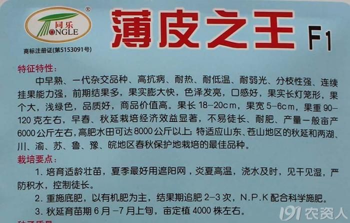 皮薄之王中早熟、一代杂交品种,高抗病、耐热、耐低温、耐弱光、挂果多、膨大快,色泽发亮,果个大,皮薄有褶皱,青绿色,口感好,商品价值高。果长16-18cm,果宽5-6cm,果重百克左右,早春、秋延栽培经济效益显著,亩产万斤左右,高肥水田可达8000公斤。百度“薄皮之王”了解更多信息。