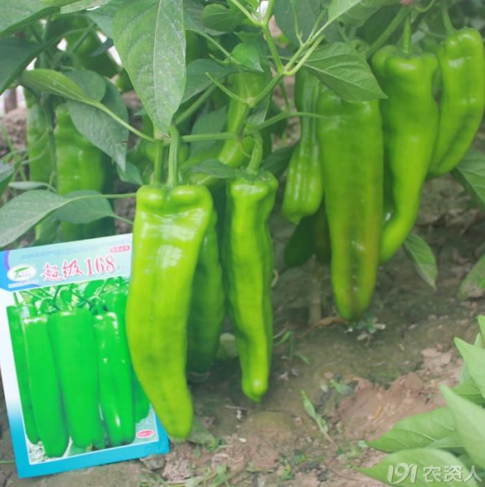 超级168牛角椒中早熟,果皮浅绿,光滑肉厚,耐运输。果长20厘米,单果重150克左右,抗病性强,品质好,产量高,一般亩产万斤左右,高水肥田有亩产7000公斤的潜力。百度“超级168大牛角椒”了解该品种更多信息。
