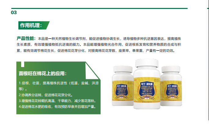 主要产品:0.03% 诱抗素水剂,2%吲丁-诱抗素可湿粉,5% 诱抗素颗粒剂,10%诱抗素可溶液剂