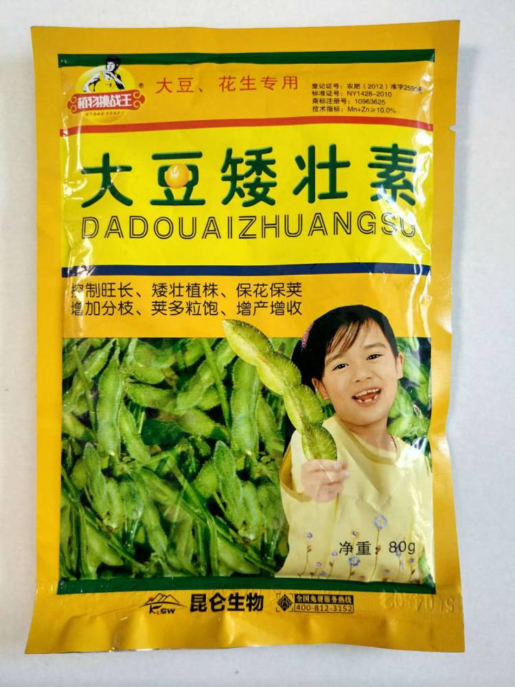 大豆矮壮素,本产品是根据大豆生长发育规律而研制的新型植物生长调节剂,施用大豆矮壮素能降低大豆株高8-12厘米,促进根瘤的形成。改善群体透光条件,提高氮素营养。增加主茎节数和茎粗,增加有效分枝数和荚数,叶色加深,叶片增厚,增加光和能力,促进光合产物运往籽粒和干物质的积累,提高产量,对照比、株高矮12%-23%,茎粗增加0.3%,荚数增加5.6-8.99%个,百粒重高0.68-1克,蛋白质含量增加8-20%,脂肪含量提高12-21%,一般增产30%以上。