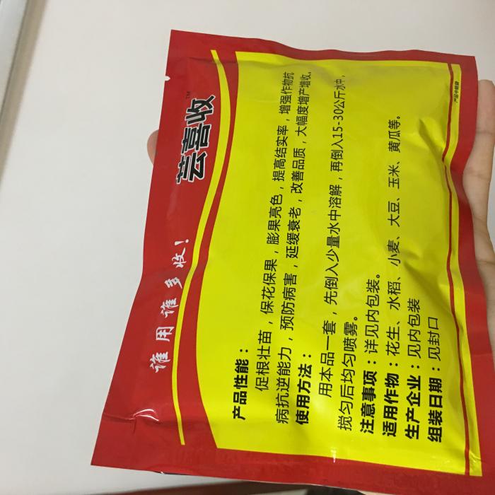 产品说明:芸喜收是爱普达公司多位资深研发人员根据作物生长规律将生态营养剂、调节剂,高效杀菌剂科学完美结合在一起的高科技产品,具有多效合一,方便省心,增产丰收的功效。