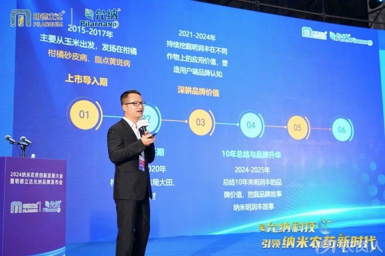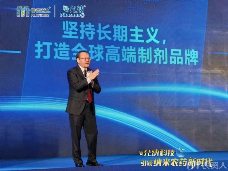 允纳科技:引领纳米农药新时代 允发生物集团董事长母灿先分享了集团的宏伟愿景——成为全球最优秀的农化企业之一。他强调,允发生物将坚持长期主义,通过允芯®技术、允纳®技术等创新手段,推动农药行业的绿色发展,努力将公司品牌打造成为全球农药高端制剂品牌,品牌定位由80分位,提升到90分位,甚至95分位。