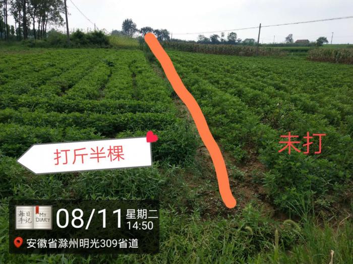 花生棵长至35公分左右,正是盛花后期,下针高峰期,喷施本品后,可讯速抑制花生疯长、旺长、起到控上促下的作用,促进营养生长向生殖生长转移,增加根瘤固氮能力和根多活力,花芽分化快、果针齐下、增加双仁果。