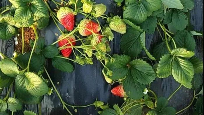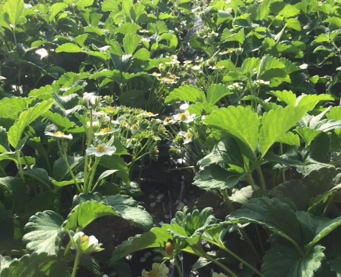 3、水肥调控。定植前已经施入了大量的基肥,要适当控水,严禁大量供水,防止苗子旺长。这时候如果不控制水分,造成植株对氮素的大量吸收,其结果必然是旺长。所以最简单直接的方法就是控制水分,减少速效氮肥。需适当减少灌水,见干见湿。控制氮肥用量,增加磷钾肥的供应,可以有效的控制旺长。叶面喷施雅萃-亚磷酸钾+雅萃-草莓专用叶面肥。对于植株上已经成熟的草莓要及时摘除,以免影响后续的草莓生长。