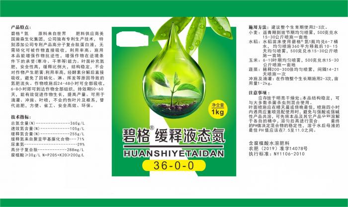 碧格®缓释液态氮产品原料来自世界顶级肥料供应商美国瀚森生化集团,公司独有生产技术,特别添加公司专利产品高分子复合肽蛋白液,无需转化可被作物直接吸收,利用率高。施用本品能增强作物抗逆性,增强作物在逆境条件下的承受(寒冷、干旱等)能力。叶面补充氮肥,安全性高,缓释比例大,结构稳定,不会对作物产生肥害;利用率高,经酵素分解后直接吸收,避免了因硝化、淋、挥发等原因导致的氮肥流失。作物喷施后24-48小时可全部吸收,6-8小时即可到达作物全部组织,持效期50-60天,能有效促进作物生长,提高产量。可用于滴灌、冲施、叶喷,不会灼伤叶片及根系,替代追肥,方便、省工、安全高效、环保。
