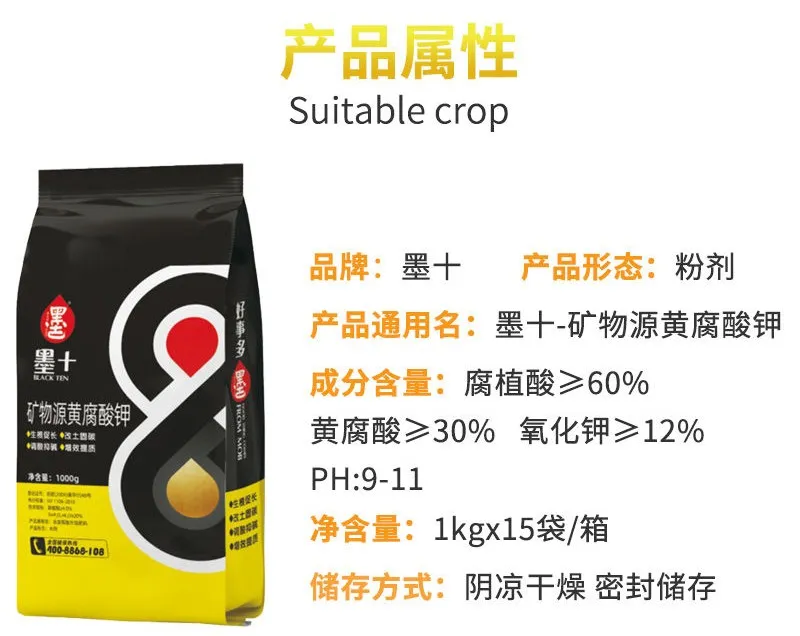 墨十——矿源黄腐酸钾采用优质风化煤中提取的矿物源黄腐酸与氮、磷、钾络合而成的多类合剂,解决作物增产增收问题。