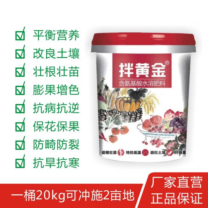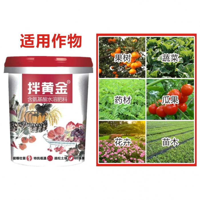 拌黄金是以动物源氨基酸为基础富含两种特殊生物活化剂,乙酰硫代脯氨酸和叶酸及有机碳。能快速有效的进入植物组织,促进蛋白质的合成,同时促进作物生根、发芽、生长、果实膨大、改善作物光合作用。促进作物在逆境情况下的生根、发芽、帮助作物抵御各种胁迫因素,如环境的土壤改变(干旱、盐碱、药害、霜冻等)引发的植物病害和根部缺氧及果实脱落问题。