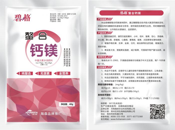 钙镁片--瀚森农业卖点:本品是一种高含量水溶性钙镁肥,能快速补充钙镁元素,作物可直接吸收,提高作物对钙的吸收利用率,对作物因却钙缺镁所引起的苦痘病、黑心病、裂果病、脐腐病、空心病、黄叶等效果显著。含高活性钙元素,在糖醇聚合物的作用下,有利于钙离子的移动和吸收,有效提高果实表面光洁度,预防作物因缺钙引起的多种生理性病害。含的镁有助于钙的吸收,促进叶绿素合成,达到***佳协同营养作用。溶解后呈弱酸性,具有PH值调节功能,能够缓冲稀释用水的酸碱度,更适合与酸性农药、肥料混用,增强杀虫剂、杀菌剂的稳定性和药效。