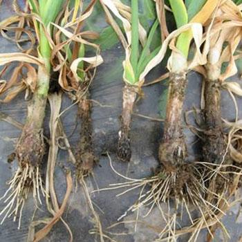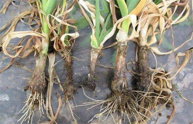 主要表现在叶片和鳞茎上。发病从外部叶片开始,逐渐向内侵染,初期鳞茎以上外部叶片发黄,根系不发达。后期鳞茎腐烂枯死,病部表皮下散生褐色或黑色小菌核。带菌的蒜种、雨水、土壤、病残体和土杂肥等均可引起发病。土质粘重,透水性差的土壤易发病;氮肥用量过大地块易感病;一般发生地块减产30%,严重地块造成绝收。