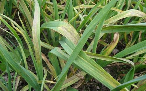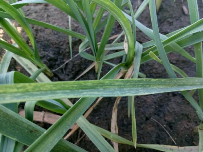 大蒜受害后,先从叶缘或中脉发生,形成黄白色条斑,湿度大时病斑呈黄褐色软腐状,一般先从脚叶由下部向上部扩展,后期全株萎蔫死亡。黑土、粘重土壤发病重;若栽种过早、氮肥使用量过大导致大蒜旺长易感病。