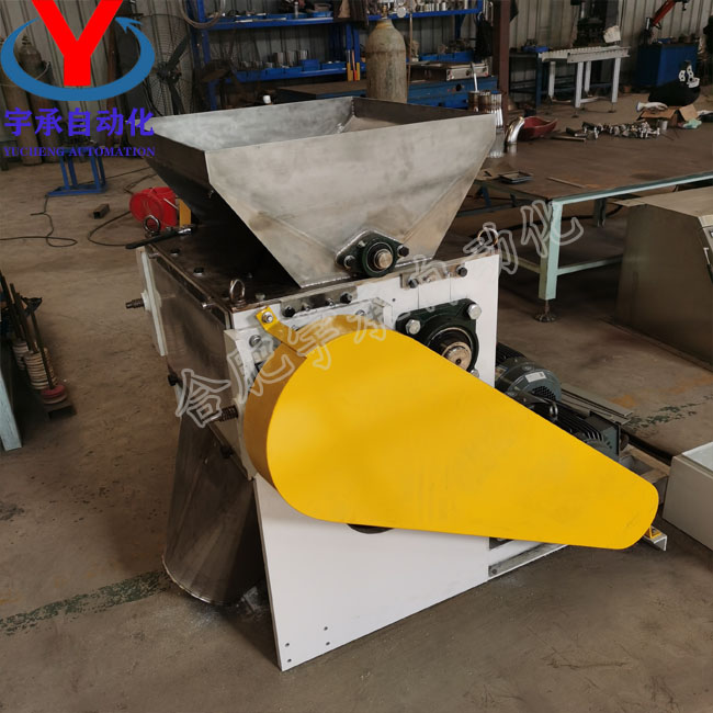两轧辊相向转动,把物料挤、碾粉碎,粉碎速度快,不粘辊、操作简单可靠,无易损件。
