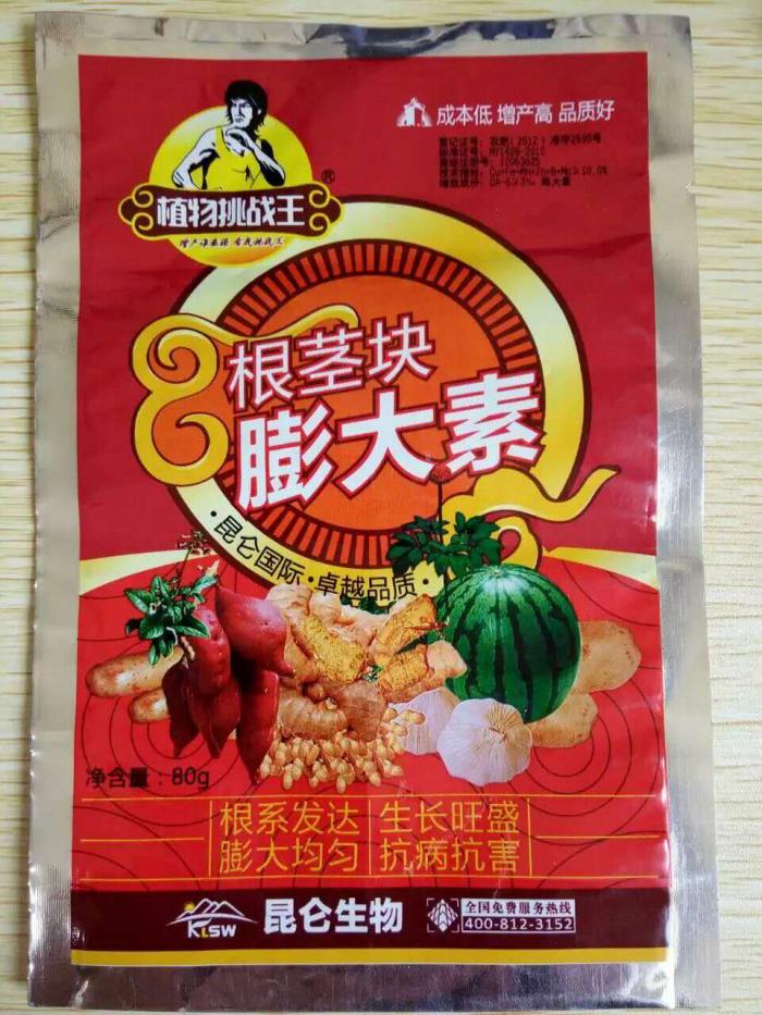 依据根茎块作物的生长机理精心研制的膨大增产制剂,克服了连续种植引起的土壤板结,并迅速活化土壤中的氮磷钾成分转化为营养,植物吸收后,可促进内源激素转移,增强光合作用和多种酶的活性,促进花青素和蛋白质的合成,促进茎块作物的细胞分裂,增加叶绿素的含量,生根壮苗,解磷解钾,固氮,根系发达,生长旺盛,膨大均匀。特有的防病机制,使作物自身提高抗病、抗毒能力