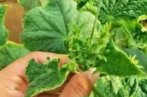 在冷凉季节种植的黄瓜,经常会出现花打顶现象。黄瓜花打顶又叫“花抱头”或“顶花”,是棚室黄瓜上常见的一种生理病害。其主要症状是:瓜秧生长迟缓或者停滞,生长点即头部簇聚团抱状,生长点附近的节间缩短,靠近生长点附近的叶片小而密集,没有新叶形成,各叶腋下生长出少量的小瓜妞。花多,但多是雌花,在较短的时间内形成雌雄花相间的花簇团抱。