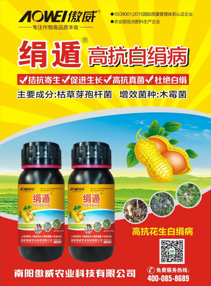 花生由于多年重茬,连作,根腐病、白绢病等一些土传性病害危害严重,这些病菌主要在土壤中越冬侵染危害花生,一旦发生一般药剂很难防治,危害程度大。