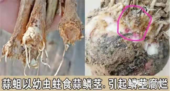 蒜蛆以幼虫蛀食蒜鳞茎,引起鳞茎腐烂,地上部叶片表现枯黄、萎蔫,甚至死亡。拔出受害株可发现蛆蛹,被害蒜皮呈黄褐色腐烂,蒜头被幼虫钻蛀成孔洞,残缺不全,蒜瓣裸露、炸裂,并伴有恶臭气味。