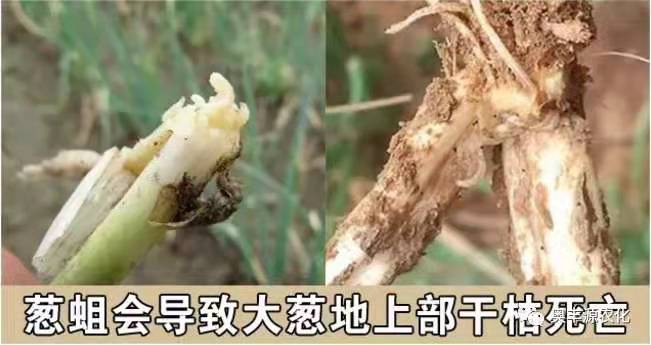 葱蛆幼虫钻蛀于葱心叶和叶鞘上蛀食叶肉和表皮,并形成灰白色不规则蜿蜒潜道,幼虫在潜道中钻行于葱叶各处,危害叶脉,严重时会导致大葱地上部干枯死亡。