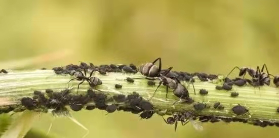 4、蚜虫分泌蜜露,滋生真菌,造成叶片和果实上的煤烟病,影响植物的呼吸和光合作用,而且蜜露容易招引蚂蚁,妨碍甚至驱散授粉昆虫和蚜虫天敌的靠近、捕食。