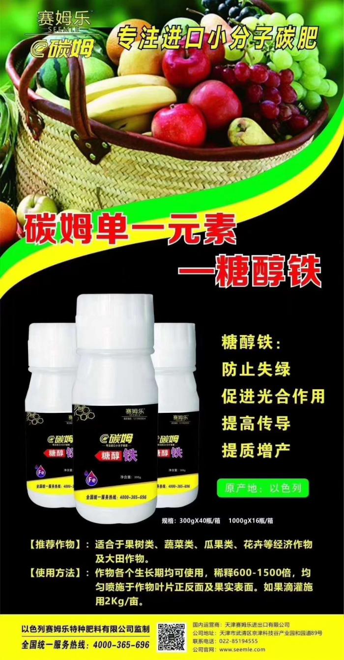 铁元素,由于有了糖醇的加持可直接被作物叶部、茎部、果实直接吸收利用,具有常规铁肥无法比拟的补铁速度和养分利用率。能够促进光合作用。糖醇铁有效改善阴雨天导致根系吸收问题对作物造成的叶片失绿、长势衰弱等影响。另外促进果实着色。糖醇铁可促进果实均匀着色,加强果蒂与果实连接韧性,有效预防生理性落果。提高植株抗病抗逆性。糖醇铁可加速作物新陈代谢,提高养分利用率以及植株抗病、抗逆能。