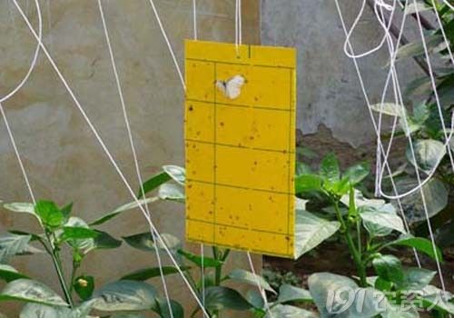 依据白粉虱对黄色有激烈趋性这一特色,可在温室内悬挂黄色诱虫板诱杀成虫。每亩悬挂30—35块,悬挂高度与植株高度相平或高出植株10厘米,诱杀成虫效果显著。