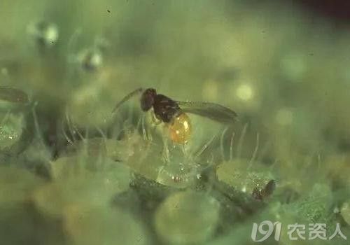 丽蚜小蜂通过寄生粉虱若虫的方式杀死粉虱,防效可达到90%以上。它将自己的卵产到粉虱大龄若虫和预蛹上寄生,10天即可从“黑洞”背面咬孔羽化出成虫,这样利用粉虱的营养帮助自己发育成长,同时羽化成虫可取食粉虱体液补充营养,从而达到控制粉虱的作用。