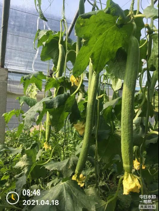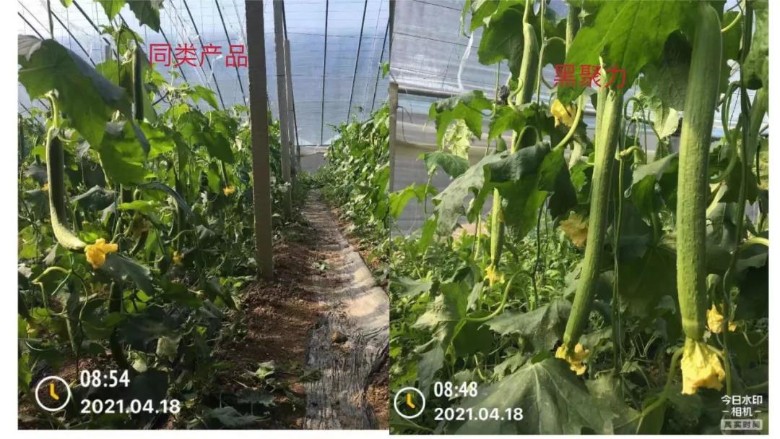 示范后:对照组:挂条较细,弯曲瓜条较多,叶片发黄。实验组:长势均匀,瓜条又长又粗,植株更高,叶片更绿。