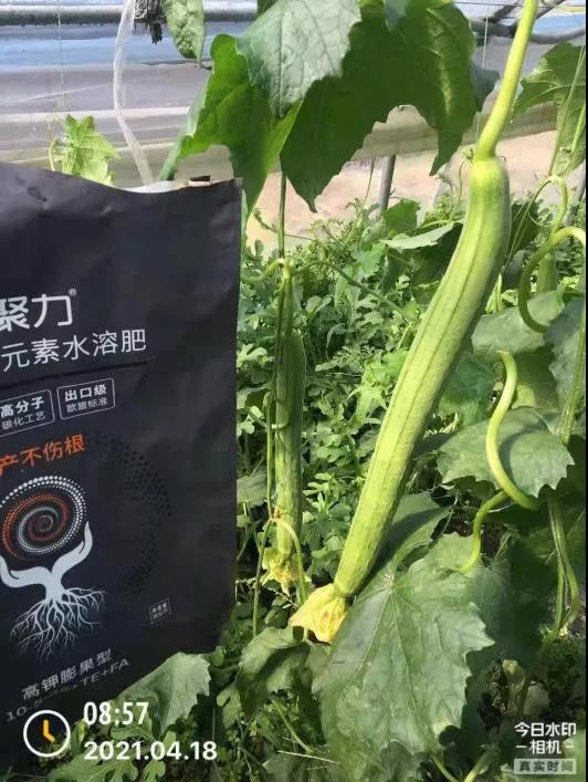 黒聚力丝瓜篇作物时期:膨果期示范时间:2021年4月13日-18日示范地点:江苏省连云港市东海县桃林镇后皇村方案:黒聚力高钾型10kg一亩