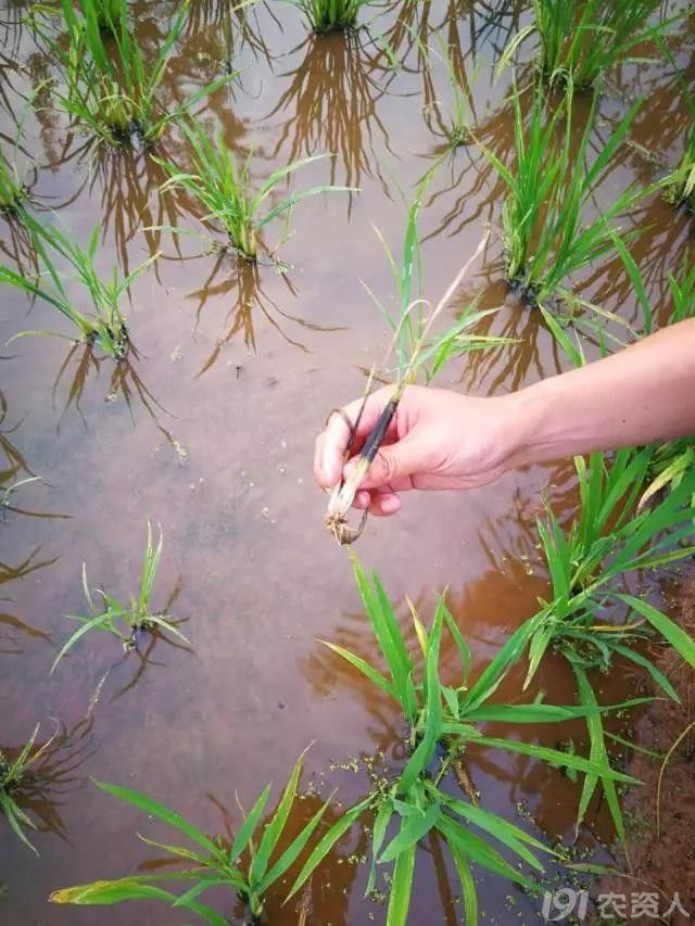3、 除草剂药害造成坐蔸:除草剂药害也是造成水稻黄叶叶多、生长不良的原因之一,很多农户整田不平,施用除草剂后关水过深,导致药膜层淹没了低处稻株的叶心,导致稻株生长不良甚至死亡。