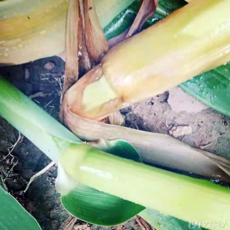 玉米细菌性茎基腐病一般多发生在玉米生育中期,主要为害中部茎秆和叶鞘。
